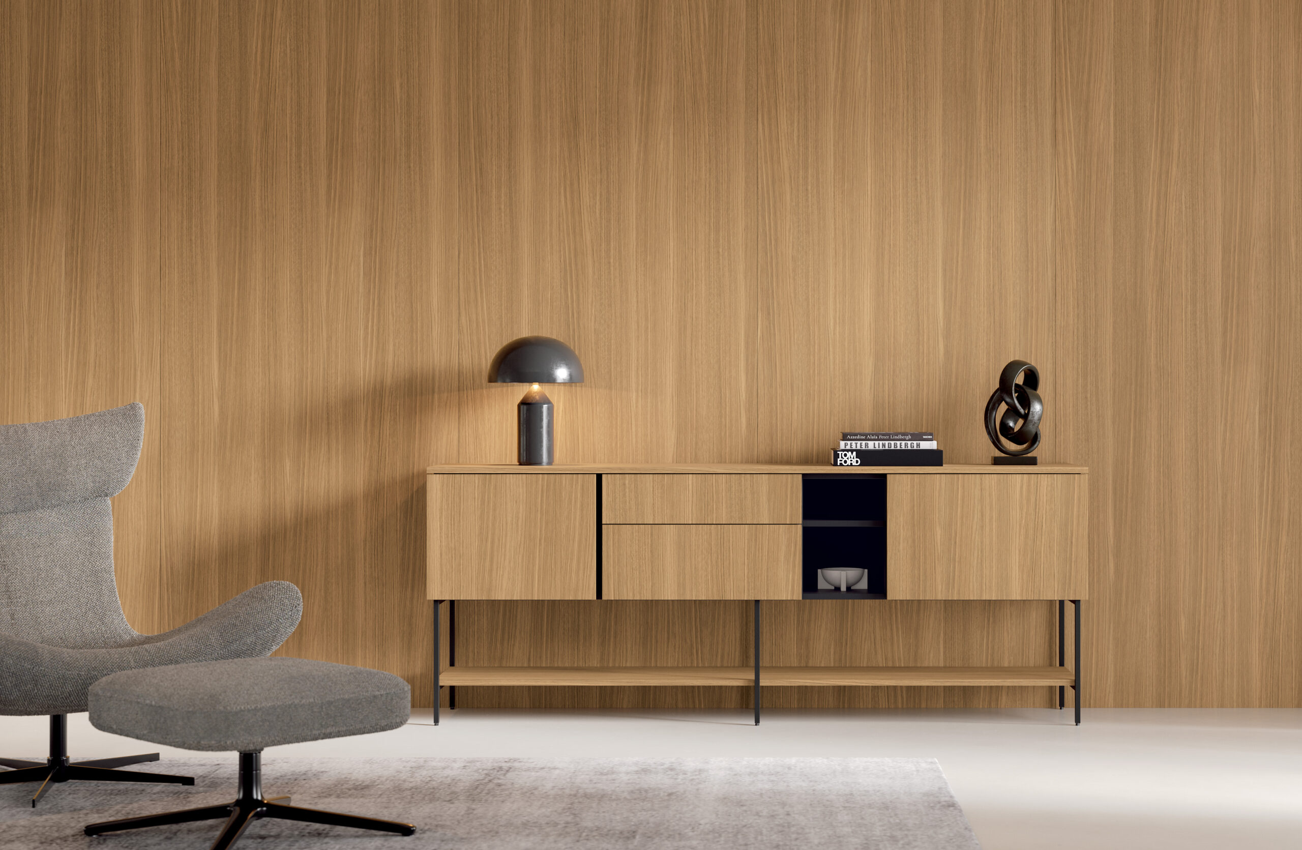 En muchos hogares el salón sigue siendo uno de los espacios más desordenados… y con más potencial. Las composiciones murales con cubos, vitrinas y cajones ayudan a disimular el almacenamiento y mantener una estética equilibrada. La combinación de estantes abiertos (para los objetos más decorativos) y módulos cerrados (para lo que no se quiere ver) permite que el orden no esté reñido con el diseño.