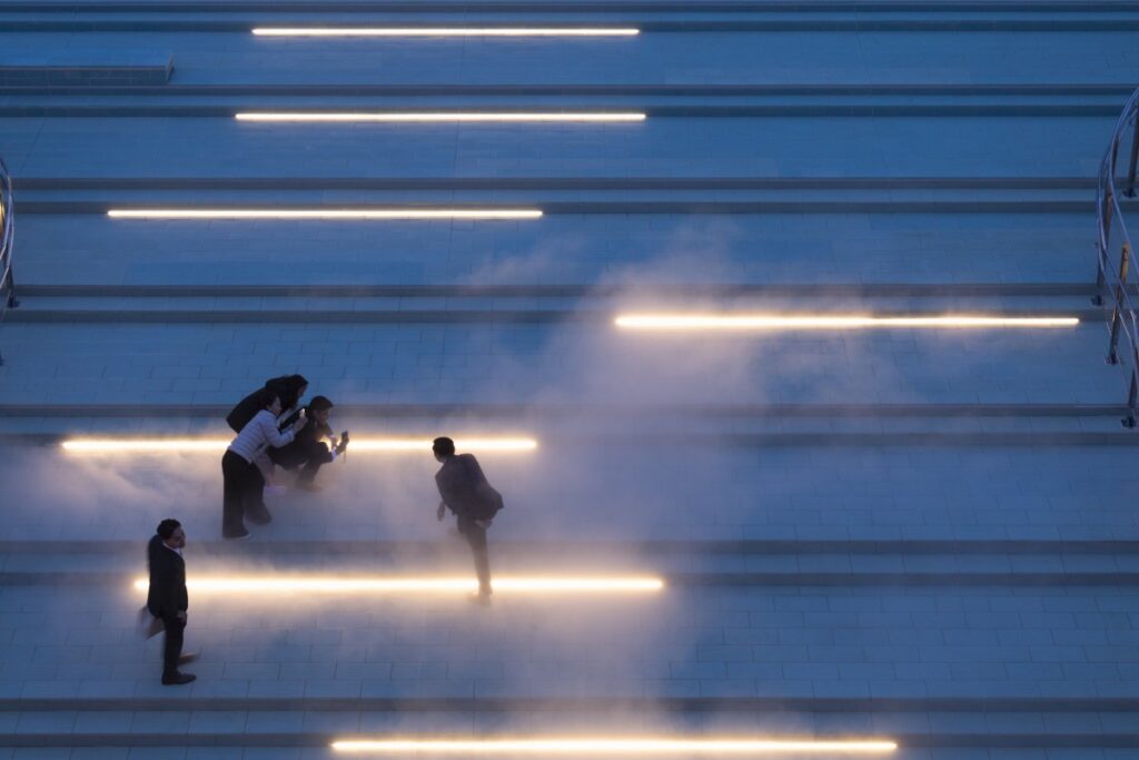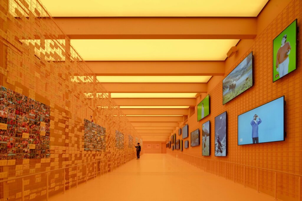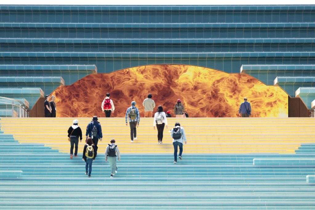 Con 3.500 m² construidos, el recorrido arranca en una gran plaza frontal —una suerte de orilla simbólica— con escaleras ondulantes que simulan el oleaje. Desde allí se accede a la “Plaza del Sol”, un espacio presidido por una gran pantalla LED donde se proyectan siete piezas de videoarte que reflexionan sobre el papel del sol en el equilibrio de la vida terrestre.