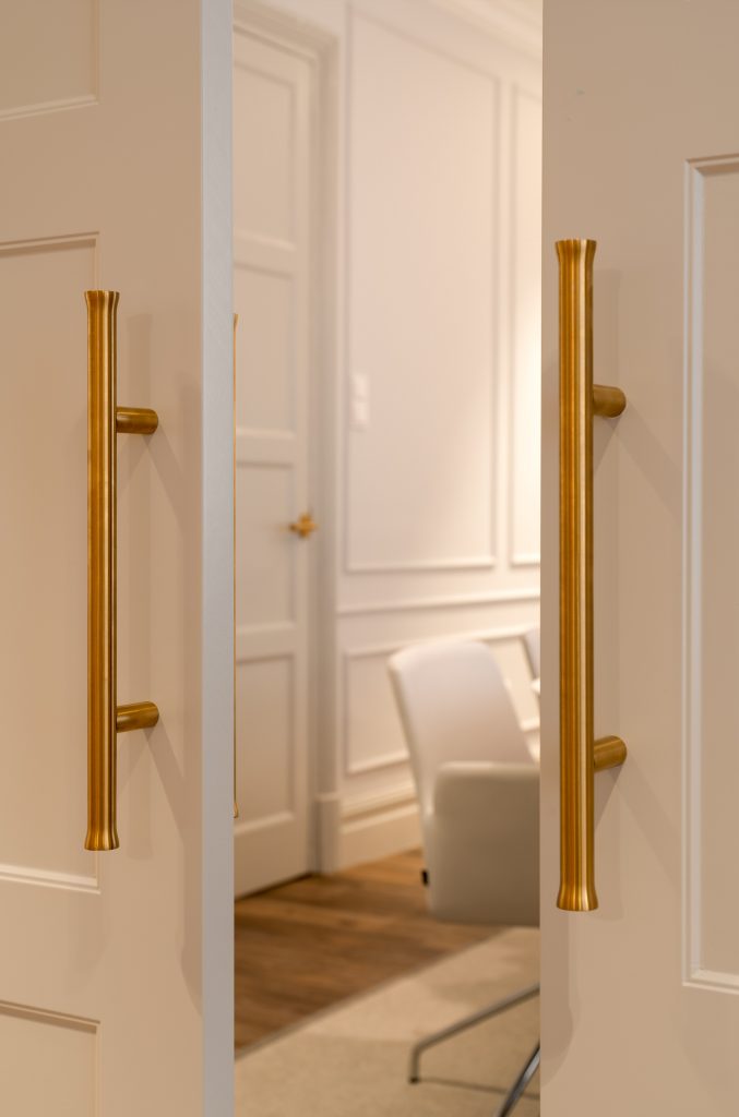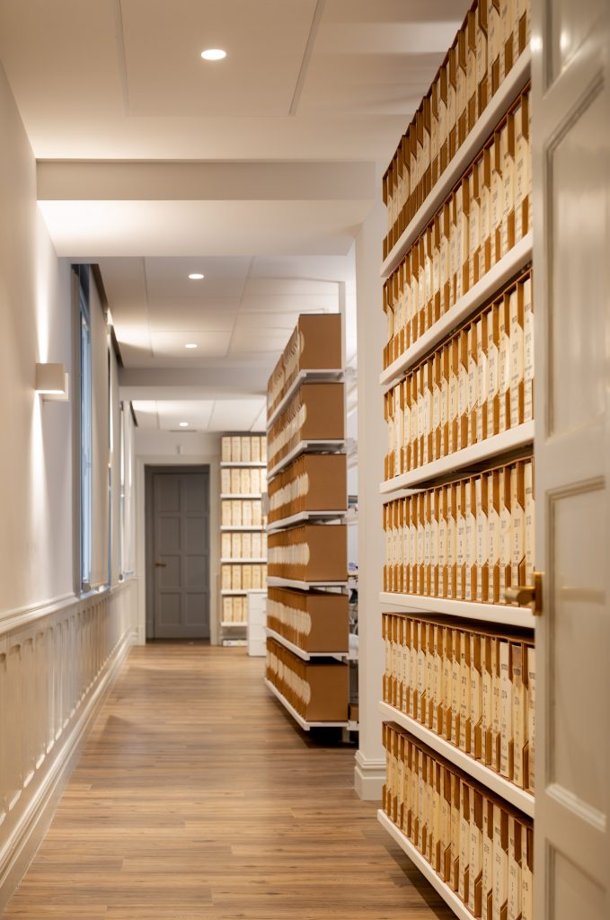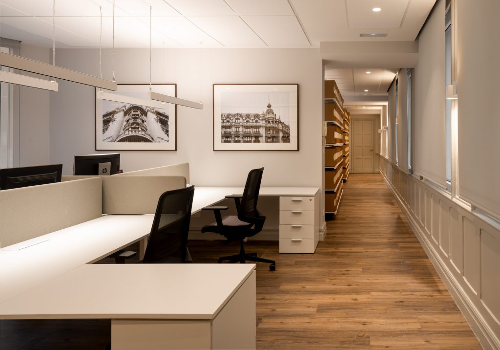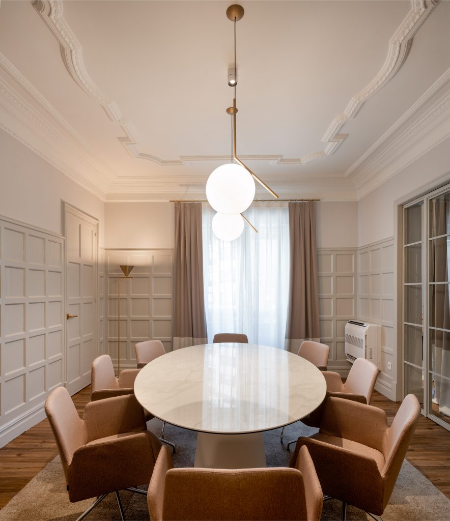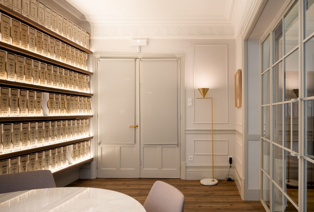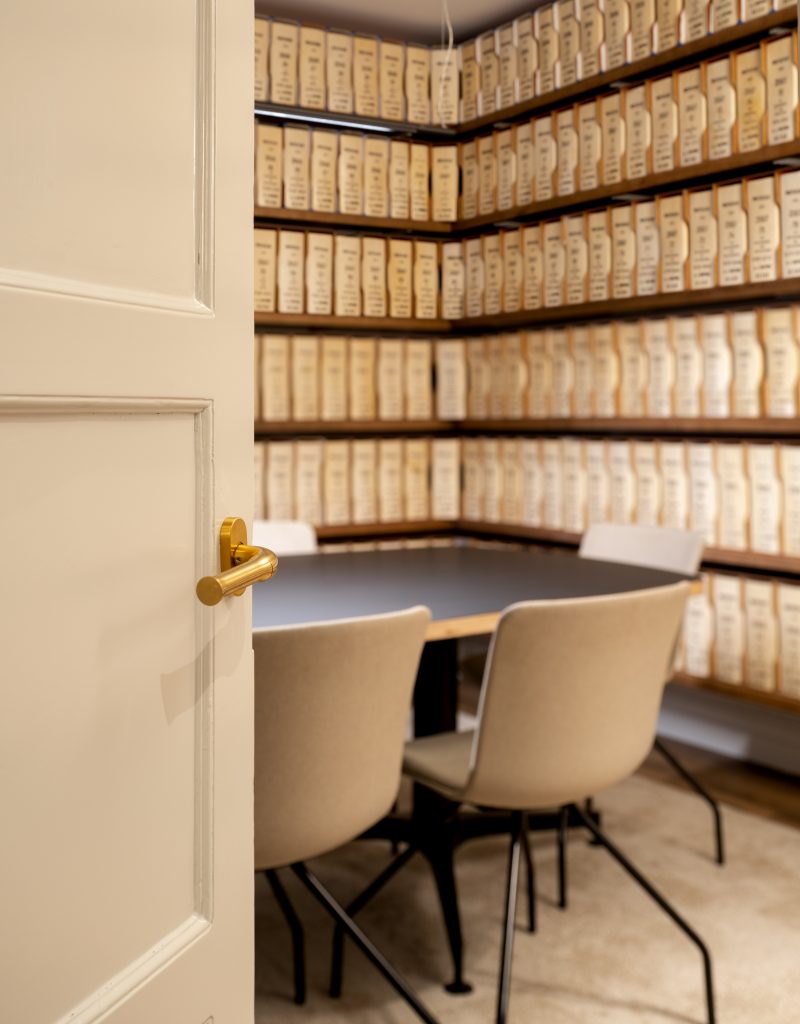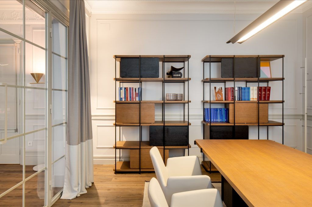 Para llevar esto a cabo se tienen en consideración las particularidades del edificio, diseñado en 1919 por Gregorio Ibarreche en el que predominan frisos y molduras originales imperantes en todo el interiorismo, restaurando el suelo de madera, e incorporando elementos mucho más contemporáneos en forma de iluminación y mobiliario. En el caso del mobiliario, Lázaro Estudio confía en la firma valenciana Momocca concretamente en la Colección Julia. Julia, gracias a su libertad de configuración, adopta diferentes roles: estanterías con paneles de madera (natural y lacada en negro), aparadores y escritorio para las oficinas. Además integra elementos del interiorismo en su propia configuración creando un ambiente sobrio y elegante que además encaja con el resto de elementos como la iluminación y las obras de arte presentes en toda la Notaría.