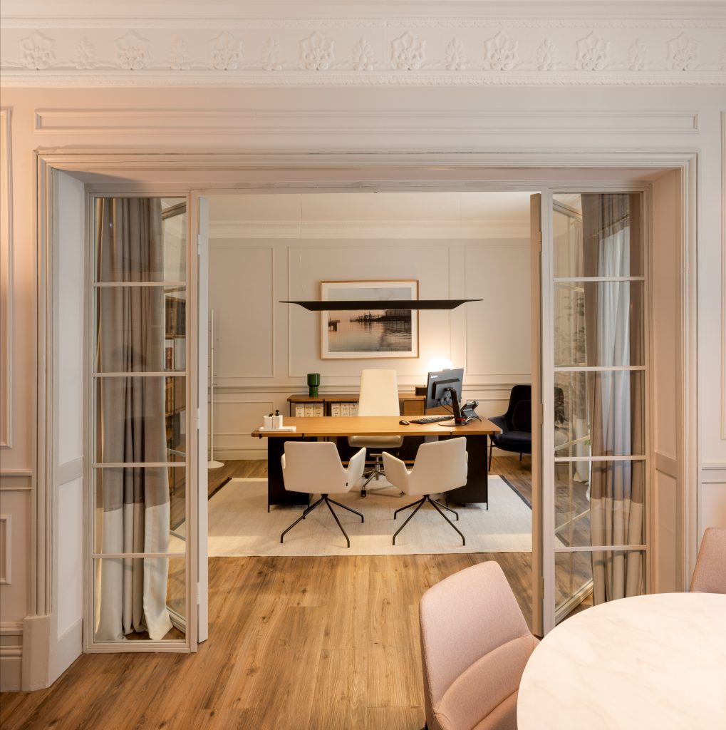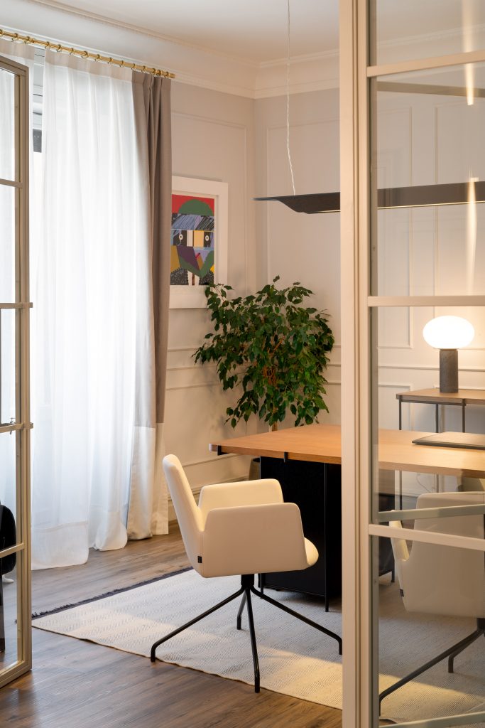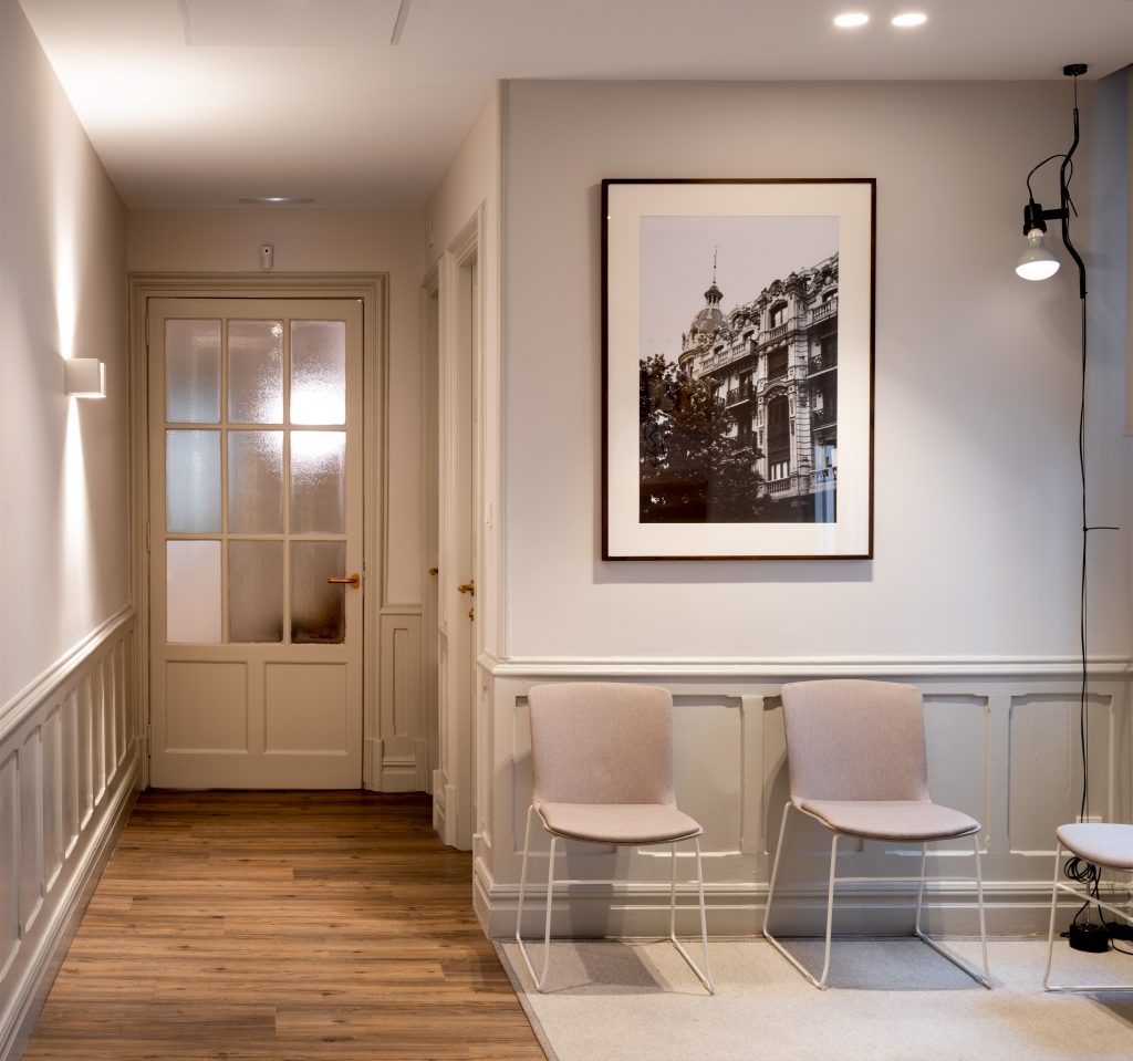 Ambos factores se unen para convertirse en telón de fondo de la gran cantidad de obras de arte que presiden las paredes de esta notaría que opta, además, por espacios abiertos y cristaleras que dan sensación de amplitud y transparencia.