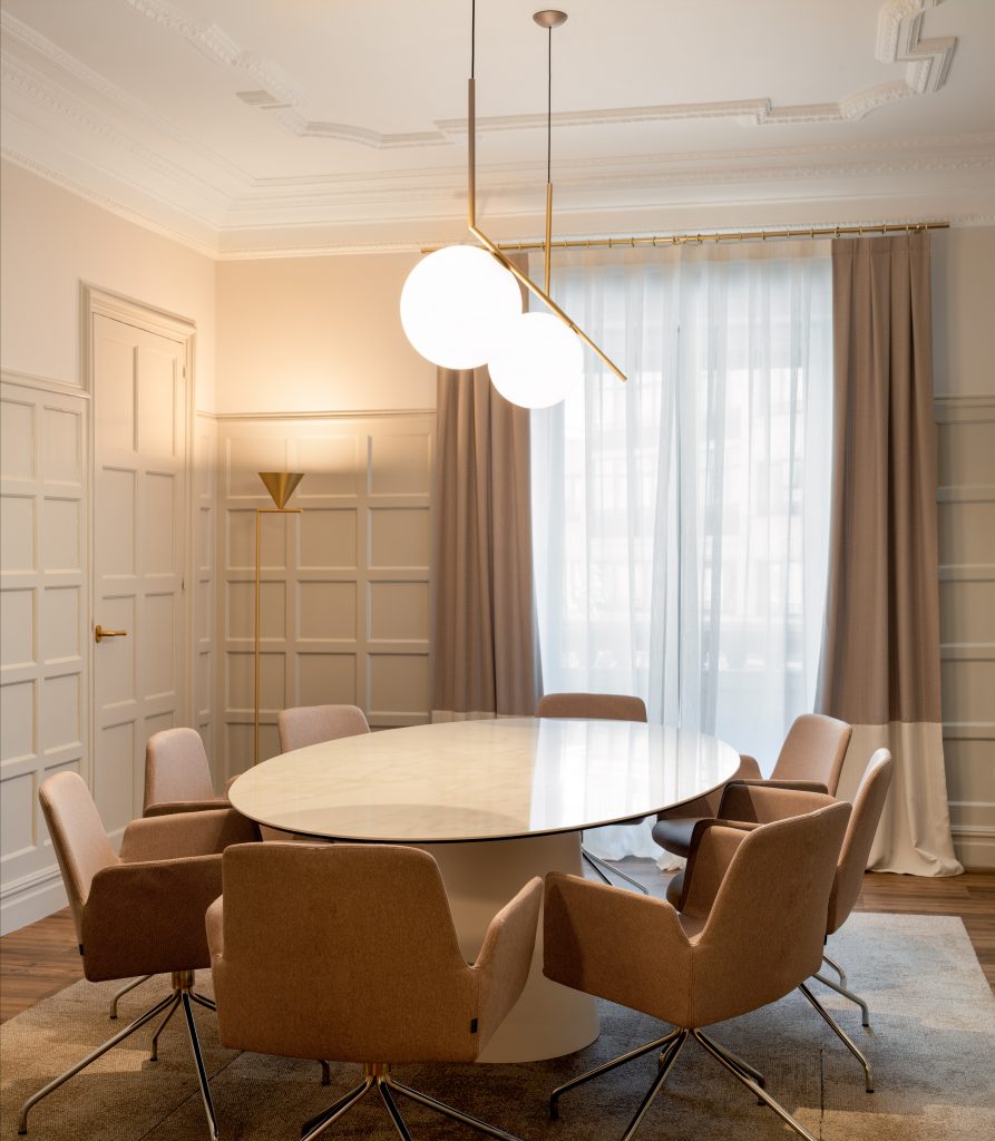 Para la iluminación se ha apostado por la firma Flos, mediante un juego de lámparas muy esculturales para las zonas más características y, por otra parte, opta por diseños más sencillos y limpios, con una iluminación sobre cada puesto primando la funcionalidad y confort del trabajador.
